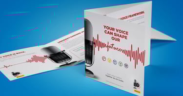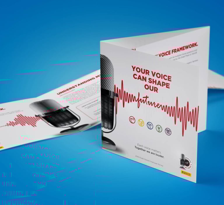 Elaboramos uma série de peças criativas impactantes, destacando o conceito "Your Voice can Shape our Future". Um dos principais elementos foi um key visual atraente, que capturou a essência da campanha e motivou os colaboradores a se engajar.
